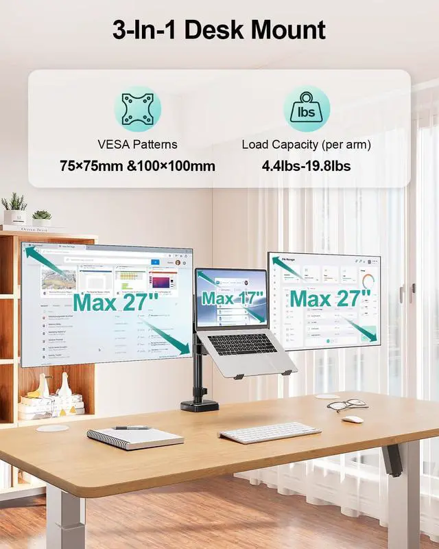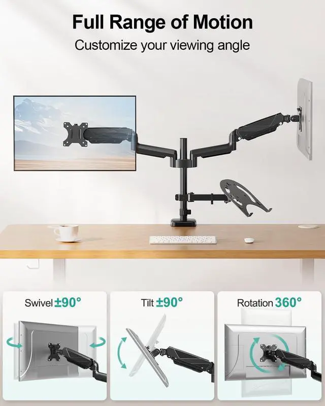 Universal Compatibility - Our monitor and laptop holder fits two 13" - 27" flat/curved computer screens and supports 4.4 - 17.6 lbs monitors. It is compatible with VESA mounting holes 75x75mm and 100x100mm. The laptop tray measures 8.9" (L) and 9.45" (W) and accommodates 10 - 17 laptops up to 17.6 lbs. ^^ Optimize Your Viewing Experience -Our monitor laptop mount simplifies monitor and laptop adjustments, enabling you to locate the perfect viewing and typing angles and positions for comfortable work. With gas spring dual monitor arms, you can rotate your displays 360, swivel them +/-90, and tilt them +/-90.