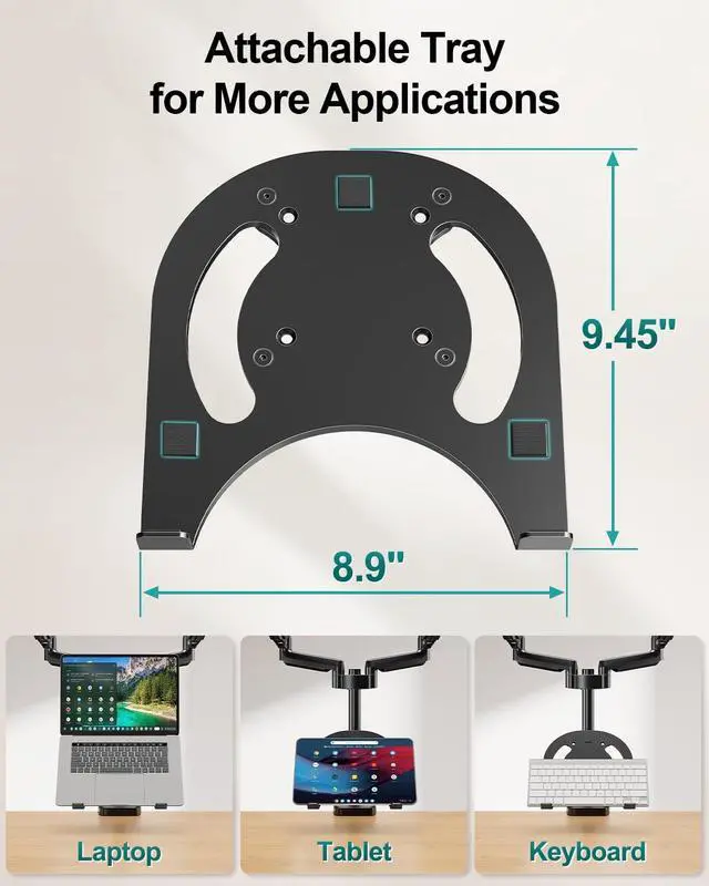 The laptop tray can be raised or lowered on the center pole as necessary. ^^ Upgrade Your Workspace - Our 3-in-1 laptop and monitor mount is designed to accommodate two monitors and a laptop simultaneously, which boosts productivity and saves desk space. ^^ Perfect for home office and teleworkers - Do you need more desk space or get tired of your neck hurting while working? The monitor arm is the perfect solution! With adjustable height, it allows you to switch easily between sitting and standing positions. Additionally, our monitor and laptop arm can help simplify your workspace and take your workflow to the next level! ^^ Safe and Stable - Our monitor arm with laptop tray provides sturdy and reliable support for your monitors and laptop, with options for both C-clamp and grommet mounting.