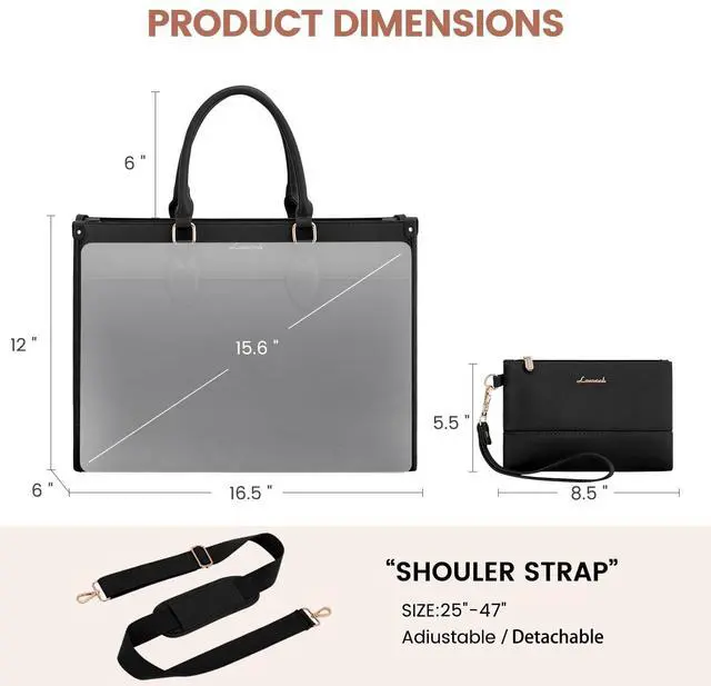 Women: This versatile tote bag comes with adjustable and detachable shoulder straps(47"-53"), allowing it to function as a handbag, shoulder bag, or crossbody bag, making it ideal for work. The rear concealed zippered pocket securely stores important documents. ^^ Free Clutch Bag & Reliable Warranty: A charming clutch bag ( 8.5" L x 5" H) is included for storing small personal items like mobile phone, glasses, and cosmetics. The briefcase for women is a perfect gift for mothers, daughters, and female friends. LOVEVOOK tote bag for women provides 12-hour customer service, 90-day hassle-free returns & 3-year warranty for your peace of mind.