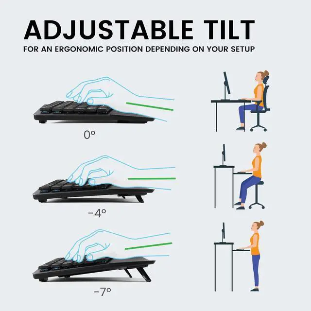 Tilt Wrist Rest: The integrated palm rest supports the palm and wrist while correcting the wrist pronation while typing to prevent unwanted pressure and muscle strains with 0, -4, and -7 degrees.