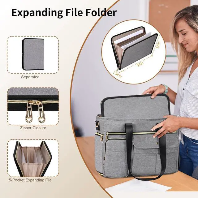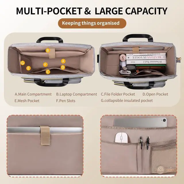 Insulated Pocket Design: Compared with other laptop tote bag, Ours comes with an extra expanding file folders featuring 5 pockets for documents, A4 paper & important files. Also equipped with a small collapsible insulated side pocket for sandwich, fruit, hamburger, snack, cold c0la, can keep food's temperature and keep bag clean.
