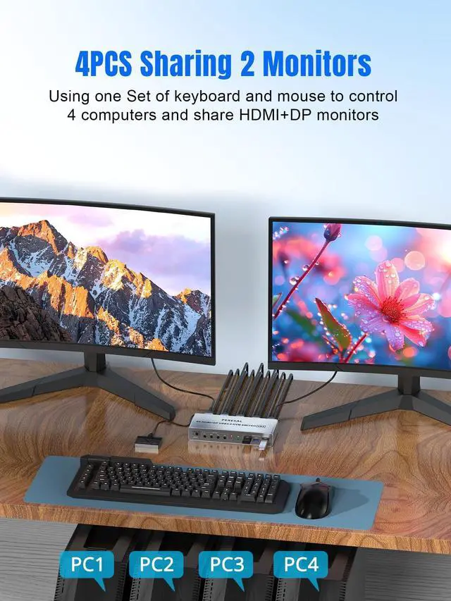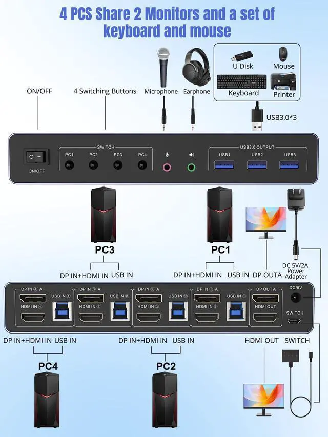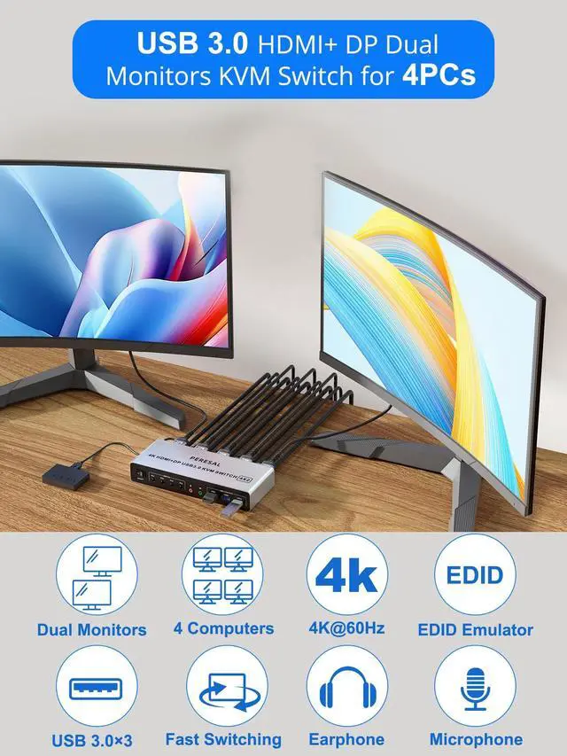 mode: two monitors output different pictures ^^ Audio Microphone PortsThis KVM HDMI+Displayport switcher Come with a 3.5 mm Audio Jack port with a DAC chip inside and a 3.5 mm microphone interface, which can be inserted into a 3-segment 3.5 mm earpiece device and microphone ^^ With Simulation EDID This KVM dual monitor switch can simulate the EDID of the display, store the resolution and refresh rate of the display, it comes with EDID emulators in each input port, keep PCs always having correct display information. Another feature of EDID is the ability to automatically identify the best resolution ^^ Displayport HDMI KVM Switch 4 Ports with 3 USB 3.0 Ports This 4 computer 2 monitor kvm comes with 3 USB 3.0 ports for sharing USB devices, such as keybaord, mouse, scanners, printers, U disks and more other USB devices. This KVM Switches also supports a variety of input devices, such as PC, Laptop, PS4, etc. Compatible with a variety of computer systems like Windows 7/8/10/11/Vista/xp, Linux, Mac, and so on ^^ What You Get This KVM Switch is equipped with 4 USB 3.0 cables and 1 desktop remote control and 1 power adapter.