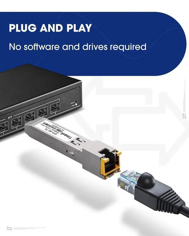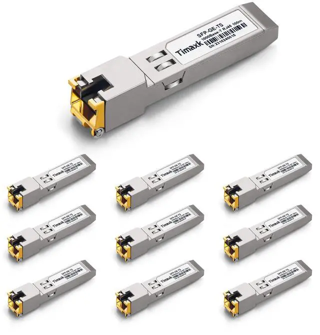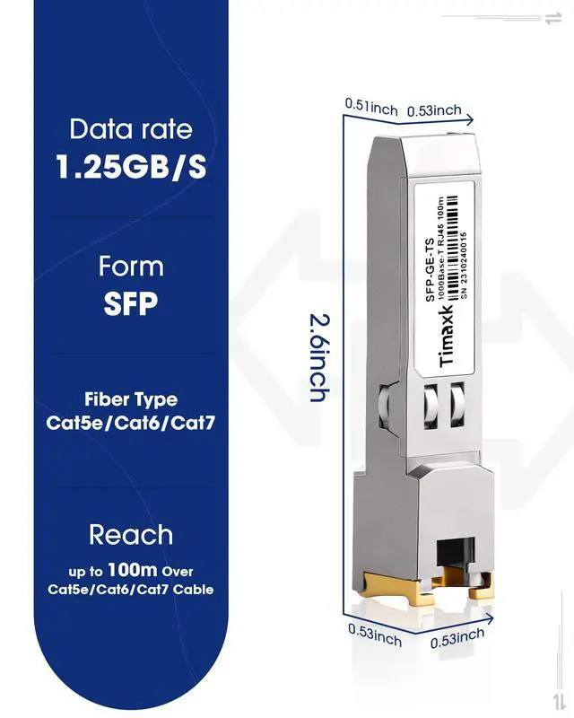 Rate: 1.25G b/s, Interface: RJ-45 connector, Reach: up to 100m transmission over CAT. 5e/CAT6/CAT7 Cable Type. ^^ Wide CompatibilityConnects a network switch, routers, NIC, server or other fiber optic equipments with 1 Gb SFP ports to RJ45 Gigabit Ethernet network. Compatible with Cisco, Ubiquiti, Mikrotik, D-Link, Netgear, Qnap, Linksys and others. ^^ Easy to usePlug and play, fully hot-pluggable. Easy installation. Rotate the ring latch down at 90 degree angle to unlock, then pulling transceiver out from switch. ^^ Durable raw materialsIt adopts the high quality of raw materials, to ensure strength and reliability for a long time, maintaining a stable connection in a wide range of environments. ^^ 100% UsableIn Timaxk Signal Integrity Lab, we 100% passed tested. Each transceiver is individually tested on switches before delivery.