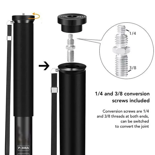 ^^ Removable: Portable monopod bracket has removable 3/8 footpad, with foot support or bracket, can be used as a live bracket, hand rope removable, with 1/4 screw hole, can be connected to the bracket.