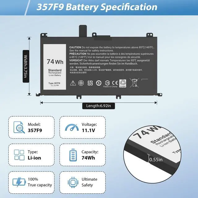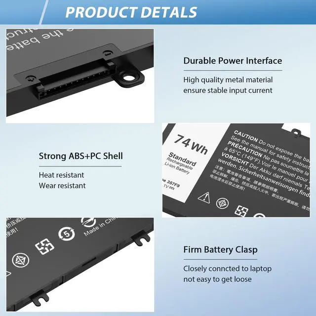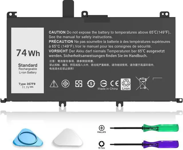 Laptop Models: Compatible with Dell Inspiron 15 5000 7000 Series Gaming Laptop15 5576 5577 7566 7567 7557 7559 Compatible with Dell INS15PD-1548B INS15PD-1548R INS15PD-1748B INS15PD-1748R INS15PD-2548R INS15PD-2548B INS15PD-2748R INS15PD-3948B INS15PD-1848B INS15PD-3848B INS15PD-2748B ^^ SecurityOur 357F9 Battery is highly Compatible with the original 74WH Type 357F9 Battery and meets CE/FCC/ROHS certified standards. Built-in circuit protection ensures the safety and stability of the battery. You can buy with confidence and use safely ^^