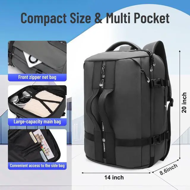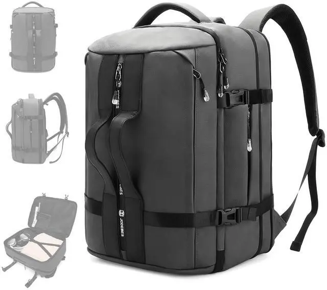 3-in-1 Convertible Travel BackpackUse it as a backpack, duffel bag or carry-on easily switch styles for business trips, vacations or daily commutes. Perfect for men who want flexibility and a clean, professional look. ^^ 180 Opening PocketThe front pocket can be use fit casual shoes, sky, kettle, umbrella, Magazine and Other goods, the backpack have 5 pocket, the main pocket can contain 4-5 chothesthe laptop pocket can 180opening can hold 15.6 inch laptop and the pocket division reasonable can meet your daily needs, Two front pocket can meet your daily needs.