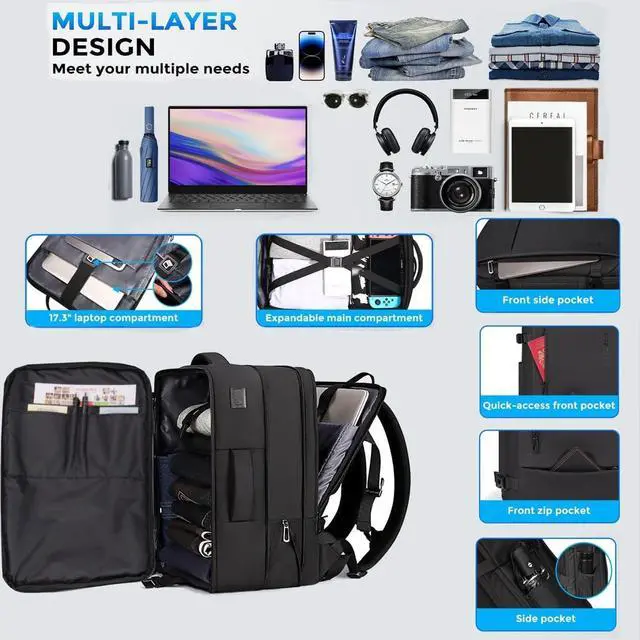 You can place anything you have to have any items, such as wallet, pen, convenient sign, etc ^^ Expandable Large Capacity 50LThe main compartment expands to hold several days of clothes, shoes, laptop, and travel accessories. Fits up to a 17.3 laptop and meets most airline carry-on size limits. ^^ Water-Resistant & Durable BuildMade from high-density Oxford fabric with strong stitching and smooth zippers, this travel backpack resists scratches, wear, and light rain ideal for long-term use. ^^ Comfortable & Easy to CarryErgonomic back padding and breathable shoulder straps reduce pressure during long travel days.