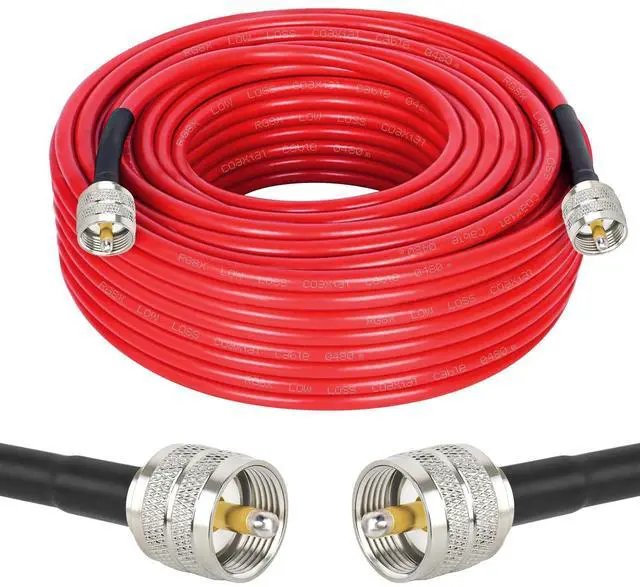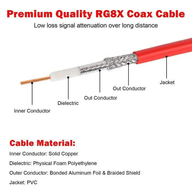 Low Loss RG8X Cable -- MOOKEERF RG8X Coaxial Cable is made with pure copper inner conductor, with double shielding to prevent signal leakage, interference and signal loss. It could support better signal transfer with minimum signal loss over large distances and higher frequency use. ^^ Premium Materials -- The inner conductor of this cb coax cable is made of solid copper, outer conductor is made of Aluminum foil and tinned copper braid which can maximum protect the signal over large distance. Durable PVC jacket allows the pl259 cable exposure in outdoor harsh environments.
