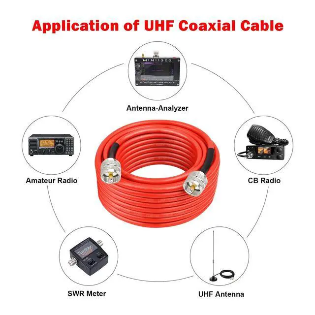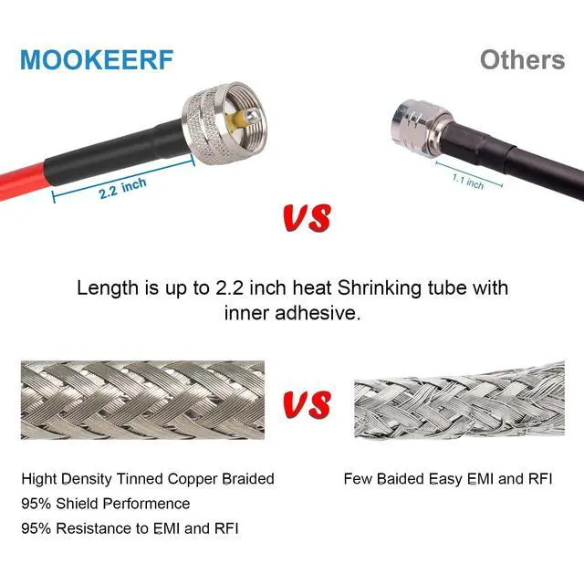 ^^ Stronger Connection -- The length of heat shrink tube that connect the rg8x cable and pl259 connector is upgraded to 2.2", which can better protect the connector from falling off. ^^ Applications -- This cb antenna cable is widly used for any 50 Ohm RF system, such as vhf marine antenna, cb radio, ham radio, vhf radio, antenna analyzer, antenna transceiver, monitor, antenna tuner, dummy load, SWR meter and ect. ^^ Professional Produce -- MOOKEERF is a professional manufacturer of RF cable, all our cables are made to the highest standards.