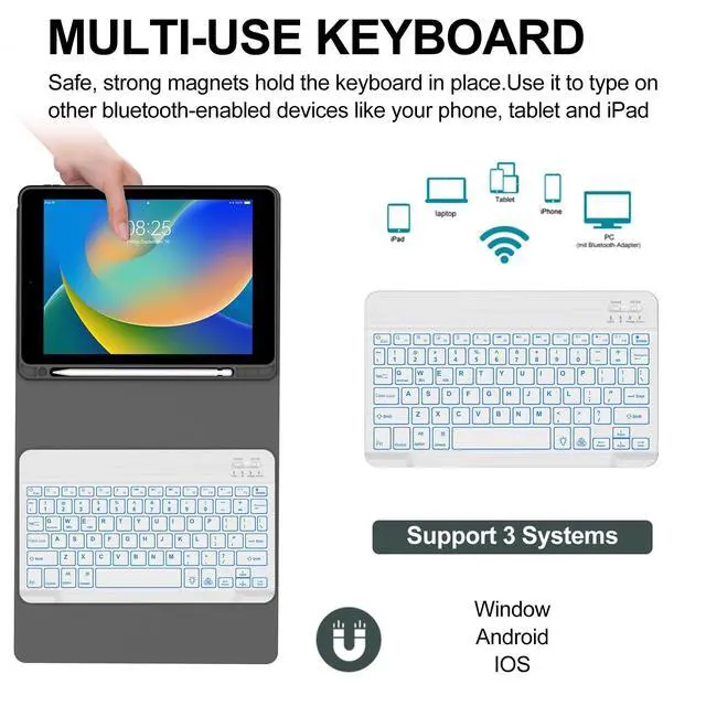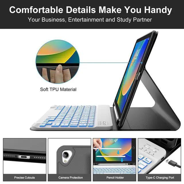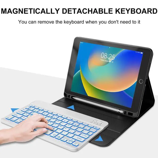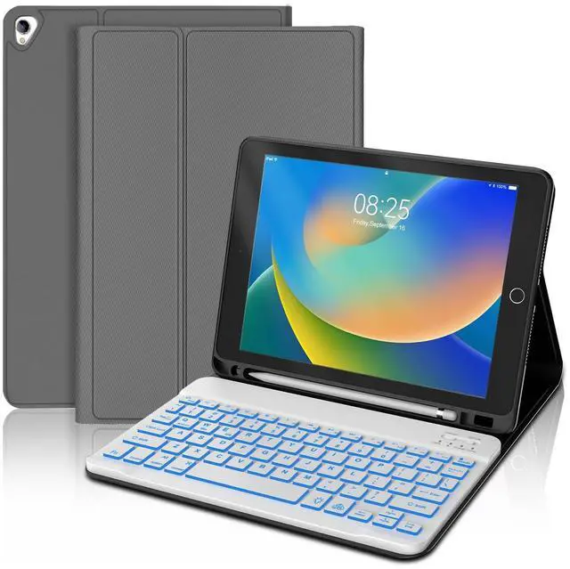 Number: A1701/A1709). Please be kindly check your iPad back model before purchasing. ^^ Detachable & Adjustable 7 Colors Backlit Keyboard- This ipad 9th generation case with keyboard designed with laser-etched backlit keys that allow 3 levels of brightness and 7 vibrant colors, make typing fun and easy in the dark or the light. The ipad 8th generation keyboard can be attached to the case magnetically, if not needed, it can be removed. Bluetooth connectivity is easy. ^^ Multiple Viewing Angles- This ipad 7th generation keyboard case has 3 grooves on the case for propping up the tablet into three different viewing angles in landscape mode. Perfect for working, writing, or watching videos. Perfect for studying, working, writing, reading or watching videos ^^ Built-in Apple Pencil Holder & Auto Sleep/ Wake Function - Our iPad 10.2 keyboard case comes with a slot for holding your Apple pencil stylus that lets you effortlessly reach for your pen whenever you want to use the touch pen function. (Apple Pencil is NOT included). It automatically wakes or puts your iPad to sleep when it is opened or closed, save much power for your iPad.