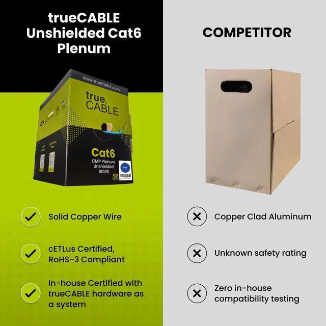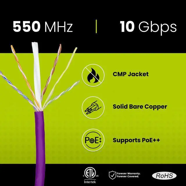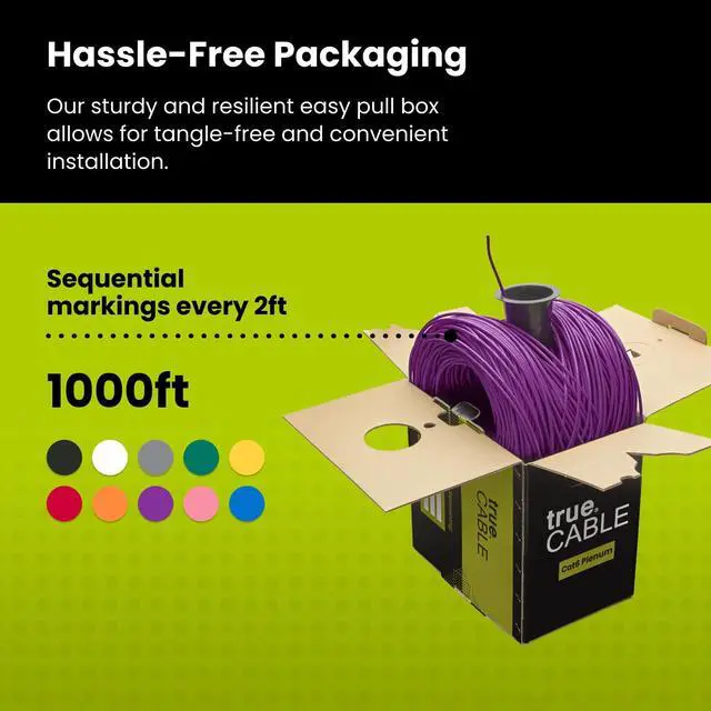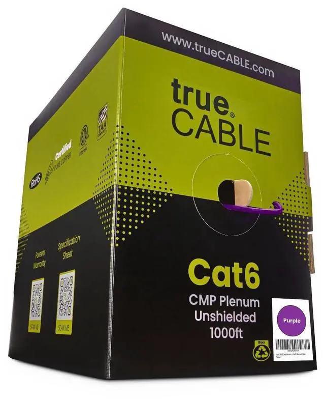 Supports Power over Ethernet: PoE/PoE+/PoE++ (IEEE 802.3 af/at/bt) 4PPoE up to 100W. ^^ [Hassle Free Packaging] 1000 feet (305 meters) has been packaged in a tangle free, easy pull box so you dont have to worry about getting behind on your next job. ^^ [Solid Bare Copper Conductors] Pure bare copper conductors offer superior signal strength, conductivity, and flexibility compared to cheaper copper clad aluminum (CCA) options. Choose pure copper for a stronger, more reliable connection. ^^ [For Use Indoors] The purple plenum jacket is fire safety rated for use in air plenum spaces above suspended ceilings or below raised floors. High degree of flame resistance and low toxicity smoke. ^^ [ Certified by trueCABLE] Our data cables have been tested with a DSX-8000 Versiv CableAnalyzer and are in compliance with ANSI/TIA 568.2 -D standards, RoHS-3 compliant, and cETLus certified. Backed by our FOREVER WARRANTY. Compatibility & performance tested with trueCABLE RJ45 Connectors - B07Y3DDLGW and B088KWF9CW.