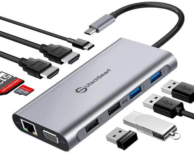Note: It does not support extend mode for macOS. ^^ Ultra-portable & Compact Powerful Workstation You could easily put the docking station in your bag or pocket. Designed from rolled aluminum to be durable yet lightweight, lighten your load and ditch the extra cable adapters, and consolidate all features with this Plug and Play laptop docking station. Including 2x 4K HDMI, VGA, USB-C charging, Gigabit Ethernet, SD/TF card slot, 2x USB 3. 0 Ports and 2x USB 2. 0 Ports. ^^ 100W PD 3.0 Technology & Smart SafetyUtechSmart thunderbolt 3 dock help you shorten charging time by one third compared to traditional chargers. Equipped with our next generation intelligent microchip which provides a slew of safety features including: internal overload protection, short circuit protection, temperature protection and etc. *Can't provide power for your latop. ^^ Blazing-fast Data Transfers & Advanced Networking The UtechSmart docking station is super fast with 2 USB 3.0 ports at 5Gbps, an SD and a TF card slot, and 2 additional USB 2.0 ports for your keyboard, mouse or charging device. The extremely fast 1000M Ethernet port helps gamers and office workers download movies or music faster, transfer files faster, and reduce latency in use. ^^ Broad CompatibilityOur USB C docking station is widely used for laptops with Windows 10/11, Mac OS, Chrome OS, Dell XPS 13/15, Dell Latitude/Precision, Lenovo ThinkPad X1 Carbon, HP Spectre x360/ZBook or other devices with USB Type-C (Gen 2) /Thunderbolt 3/4 ports which supports "Displayport Alt Mode". UtechSmart provides with 18-month product care and 24/7 customer support!