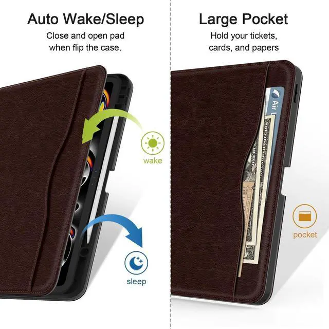 Number: A3360/A3361/A3362/A2925/A2926/A3007). Not compatible with any other devices. Please check the model number on the back of your iPad. ^^ [Full Protection] Made of durable Premium PU leather and soft TPU, front and back covered by soft Premium PU leather, the inside durable TPU can fix your iPad and protect its back cover and four corners, maximum protect your iPad from drop and scratch, the surface is soft and silky to provide a comfortable touch to the skin. ^^ [Multi Function] The front of the protective case is equipped with a pocket to keep cards, cash, and notes. And the case has a built-in pencil holder, which allows you to carry and protect your pencil wherever you go. (Pencils are not included) ^^ [Multiple Usage Scenarios] The protective case can have three anti-slip strips and a strap to keep the iPad at its most commonly used angle, making it easy for you to use in multiple scenarios, such as typing, video chatting, and watching movies. ^^ [Auto Wake/Sleep] Built-in hidden magnetic strip provides sleep/wake feature, save the energy in daily use.