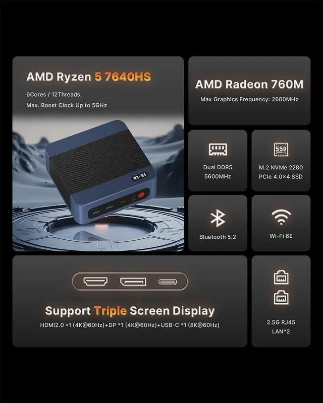 ^^ Powerful AMD Radeon 760M GraphicsGame on with the powerful P8 mini computer powered by the AMD Radeon 760M graphics (RDNA 3, 8 CU, up to 2600MHz ). This 7640hs gaming pc delivers smooth, high-framerate gameplay for popular titles like League of Legends, CS: GO, and GTA V. You can even enjoy a playable experience in many demanding AAA games at medium to low settings. With support for advanced tech like AMD Smart Access Memory and FreeSync, plus effortless AV1/HEVC decoding, your visuals will be fluid and stunning. When paired with the Ryzen CPU, it minimizes bottlenecks to boost your gaming fps and overall responsiveness. ^^ USB 4.0 /Support8K/Dual 2.5G /Wifi 6EThis wo-we 7640hs mini pc equipped full-speed USB4 port delivers 40Gbps transfers for creators, while supporting dual 4K or single 8K displays. With additional HDMI and DisplayPort, create a quad-monitor workstation. The ultimate convenience comes with USB PD charging, enabling a clean one-cable dock setup. P8 dual nic mini pc Network performance excels with dual 2.5G bE ports for link aggregation, firewalls, and fast file transfers. WiFi 6E adds the 6GHz band for interference-free wireless, while Bluetooth 5.2 ensures seamless peripheral connectivity. From professional studios to efficient offices, it's the complete connectivity solution. ^^ Quiet & Efficient Cooling & AIThe mini pc 1tb innovative active cooling system with phase change material effectively lowers CPU temperature by 25%, ensuring consistent performance even under heavy workloads.
