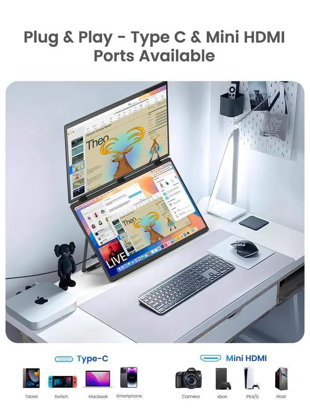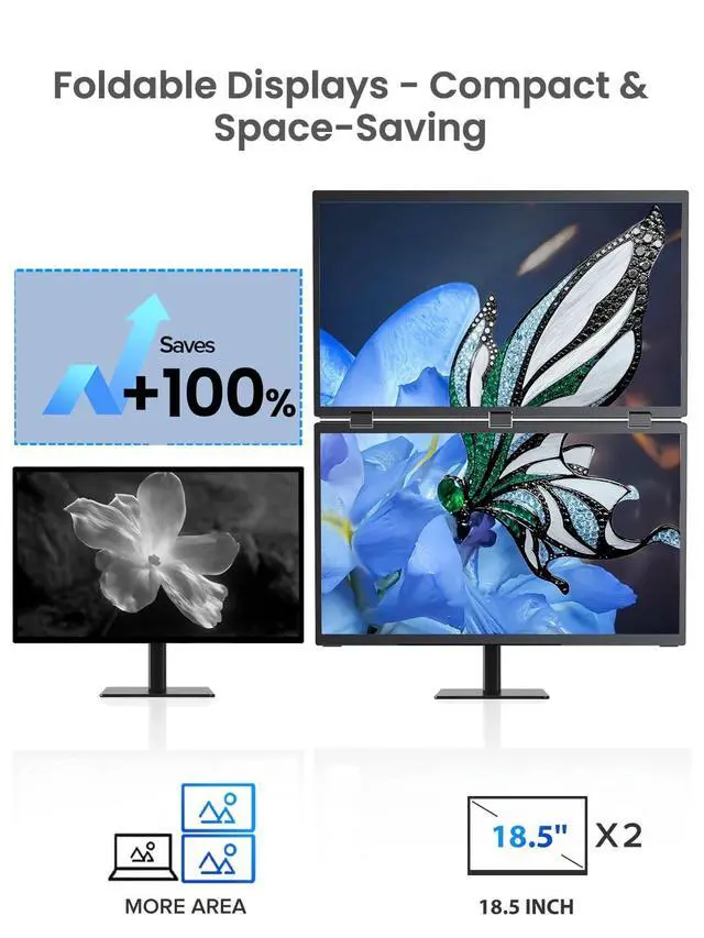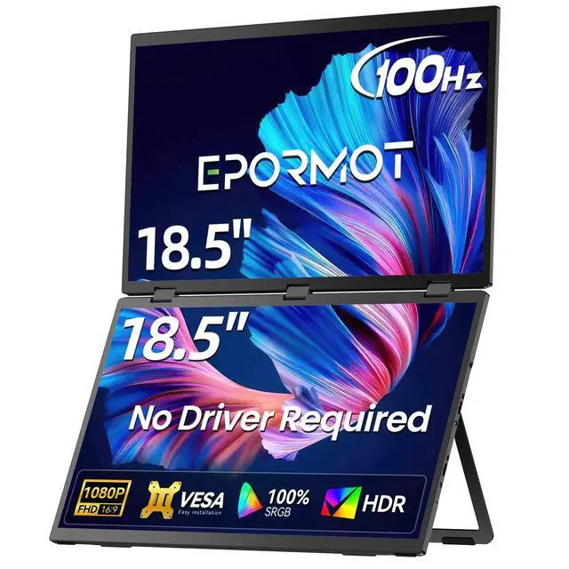 Plug & Play Dual DisplayNo drivers neededsimply connect one Type-C cable for seamless dual-screen viewing, or link two devices at once for collaborative multitasking. ^^ Enhanced Vertical WorkspaceEnjoy a 18.5" stacked dual-screen layout that reduces scrolling and boosts productivityideal for developers, traders, and remote teams. ^^ Color Precision & Eye ComfortIPS matte panel with 100% sRGB and E<2 ensures vivid color accuracy. Anti-glare, flicker-free, and blue light reduction keep your eyes fresh all day. ^^ 100Hz Refresh Rate for Gaming & WorkSmooth 100Hz performance works flawlessly with consoles and PCsperfect for immersive gaming, video editing, and fluid multitasking.