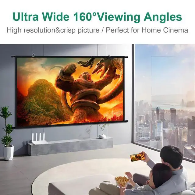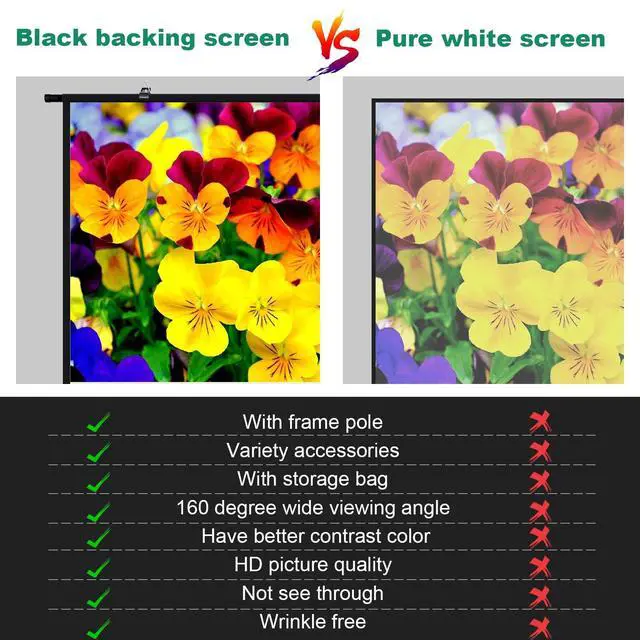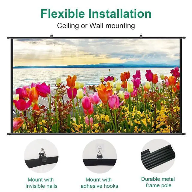 [Portable projector screen with carry bag]: The GAINVANE projection screen is a comfortable and quick solution for all those who want a space -saving, easy -to -transport product to be converted and quickly to be assembled without avoiding a large projection surface. The video screen is light and flexible and can be stowed away in the storage bag after used due to its compact design. ^^ [Easy to assemble and disassemble]: This hanging screen is quite easy to setup, only 5 minutes needed for one person to finish installation. It is quickly and easily attached to the wall, the fence or in RV. the screen is equipped with eye hook, invisible nails and hangers that can be hung anywhere to be ready for use if necessary. ^^ [High quality screen with black backing]: GAINVANE projection screen is a white, high quality polyester screen with a display area of: 89 x 50, an image format of 16:9 and a diagonal of 100 inches. These dimensions correspond to the dimensions of the projected image. A gloss white projection surface with black backing layer support front projection only, with gain 1.0 effect, you will get a great picture quality and vivid color. ^^ [Variety size for option]: This high-quality projection screen is available in different sizes, so you will surely find a suitable screen for your requirements. GAINVANE projection screens have HD and 3D options and are compatible with all HD and 3D projectors on the market. ^^ [Wide application movie screen]: This hanging projection screen is ideal for the home cinema and backyard movie night, you will never worry about light see through problem. it enables a big family to enjoy a movie night together due to a wide viewing angle of 160 degree. GAINVANE projection screen are also suitable for use in the private environment (games, films) but also in the professional field for e. g. presentations and slide lectures.