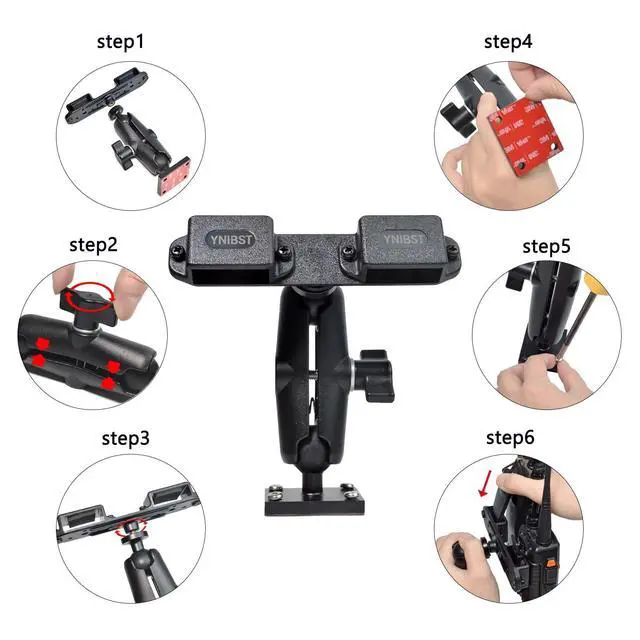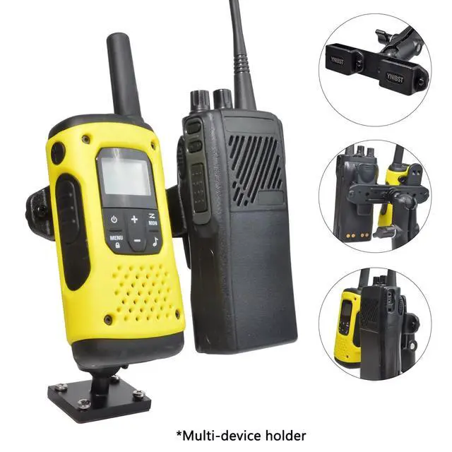 Multi-device holder-It is equipped with a multi-device holder, which allows accommodating two portable walkie talkies at the same time as long as they have a belt clip. (belt clip width36mm) ^^ Drill mount base-This handheld radio holder comes with a drill mount base with pre-drilled holes, which is great for mounting into a wall, or drilling down to a table, console and dashboard. ^^ Stable mounting-It is very stable once installed with included screws and holds your walkie-talkie firmly. The drill mount base also features adhesive bottom which helps to maximize stability.