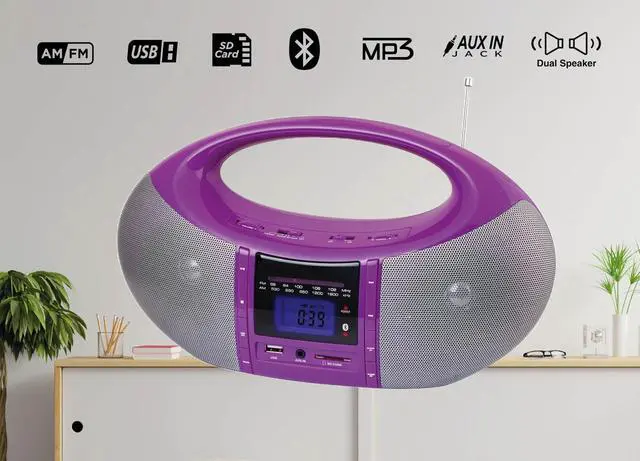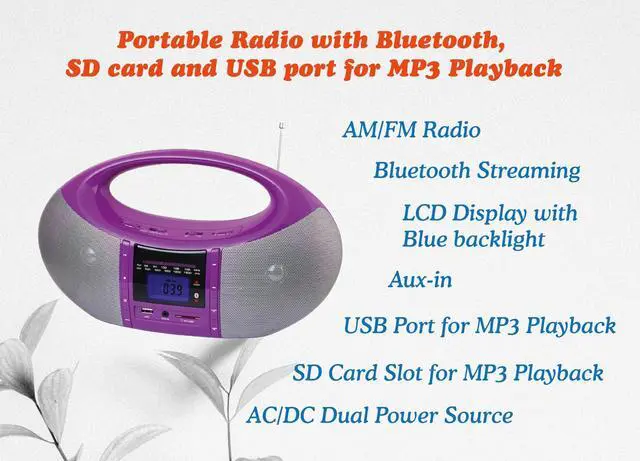 Portable AM/FM Radio, Bluetooth, USB/SD Slot for MP3 Playback, Aux-in, AC/DC Dual Power Source.