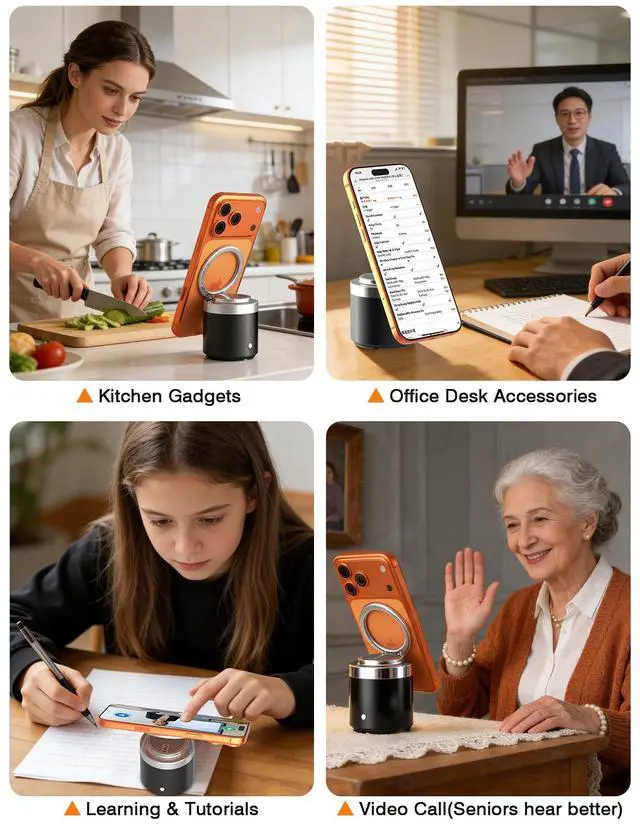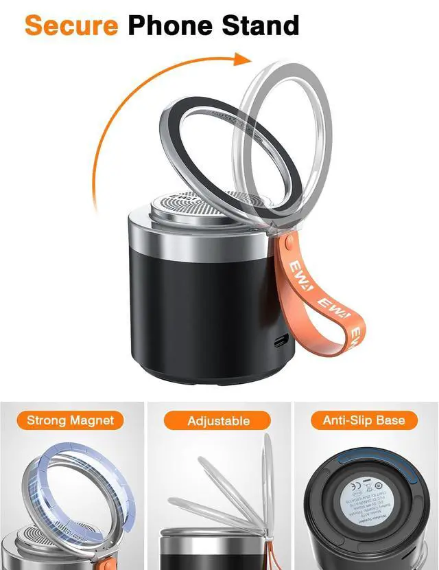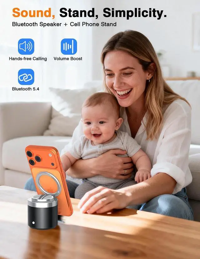 2-in-1 Bluetooth Speaker & Phone StandThis innovative device combines a wireless speaker with a secure magnetic phone holder. It provides a hands-free viewing experience while enhancing your phone's audio, making it louder and clearer for videos, calls, and music. ^^ Secure Magnetic Ring StandThe integrated strong magnet firmly holds your iPhone. The stand allows both portrait and landscape orientation, with a viewing angle adjustable up to 90 for optimal positioning. The weighted anti-slip silicone base ensures overall stability on any surface. (For optimal magnetic hold, use with a phone case that supports magnetic attachment or has a built-in metal plate.