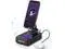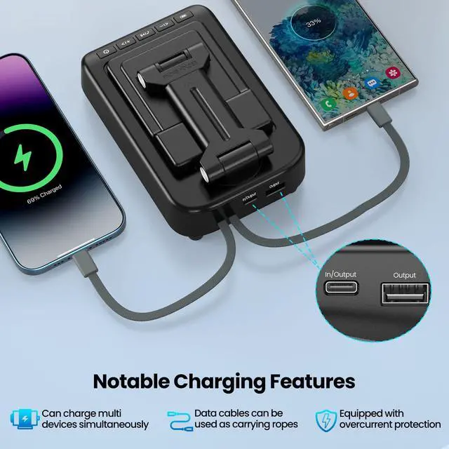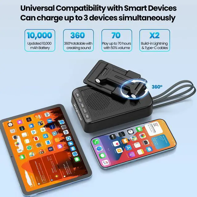 Multi purpose Charging Stand with Speaker It's an new version that features phone holder with 5.3 BT speaker for streaming media and power up your phone with built-in cables. This device can boost sound with clarity for a more immersive music experience while the stand securely holding your phone. ^^ Large Capacity Battery This chargeable phone stand not only can charge your phone on the go, but also supports listening to music all day long. Featuring with LED indicators to instantly check remaining power levels. Comes with Lightning & Type-C cables ( double as lanyards) for instant use.
