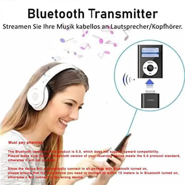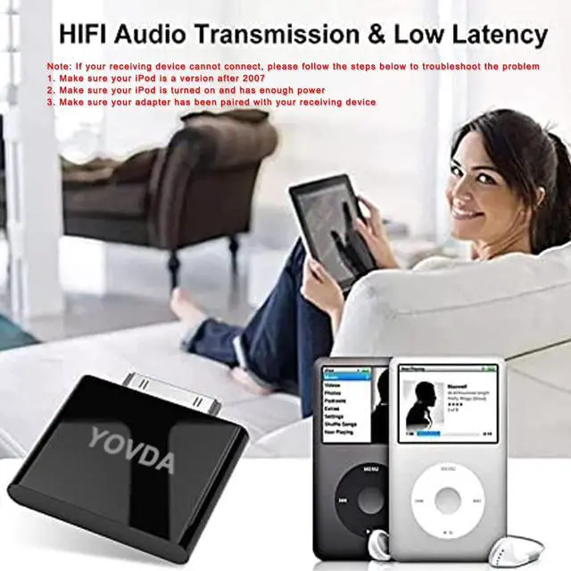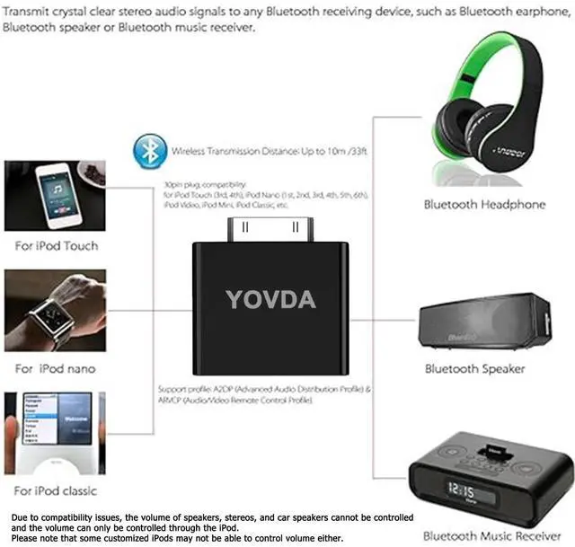 Product compatibility: The iPod transmitter provided by YOVDA is not compatible with iPods manufactured prior to 2007. Not compatible with iPod Touch 2nd generation and iPod Touch 1st generation, iPod Nano 6, iPod Mini (4GB), iPod Touch 2nd generation, iPad Touch 1st generation and iPod Classic (30GB). not compatible with iPods before 2007, iPod Touch 2, iPod Touch 1, iPod Nano 6, iPod Mini (4GB), 2nd generation iPod Touch, 1st generation iPad Touch, iPod Classic (30GB), ipod 60GB, ipod 160GB, Ipod disk 80GB etc. The automatic pairing function does not support mutual connection with car speakers. Some devices may fail to automatically connect because Bluetooth is already connected to other devices (including mobile phones, tablets, etc. ). Due to compatibility issues, the volume of speakers, stereos, and car speakers cannot be controlled, and the volume can only be controlled through the iPod. Please note that some customized iPods may not be able to control volume either. How to use? 1. When you start pairing your ipod with speakers, etc., headphones, etc.
