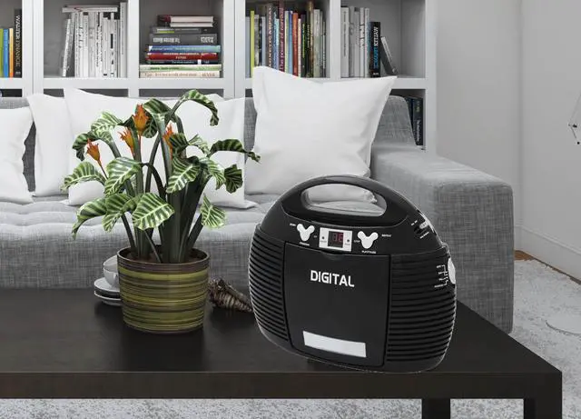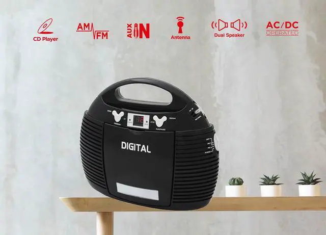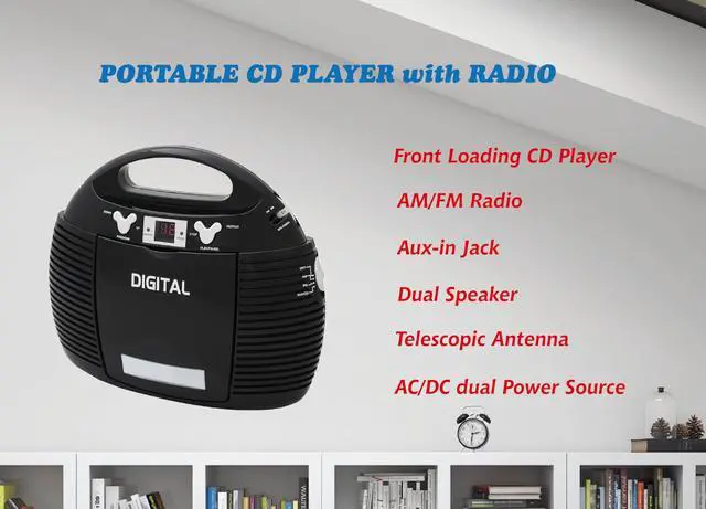 Vertical CD Player, AM/FM analog radio, Aux-in Jack for external audio devices, AC/DC dual power source.