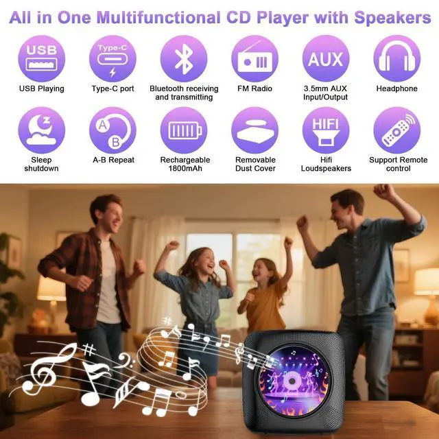 ALL-in-1 Portable CD Player: Enjoy CD, Bluetooth 5.0 (Receive/Transmit), FM Radio, USB playback, and AUX input/output. Supports CDs, CD-R/RW, MP3, & WMA. Features Type-C, headphone jack, sleep timer, A-B repeat, and built-in speakers. Ultimate versatility for home or travel audio. ^^ Portable CD Player with