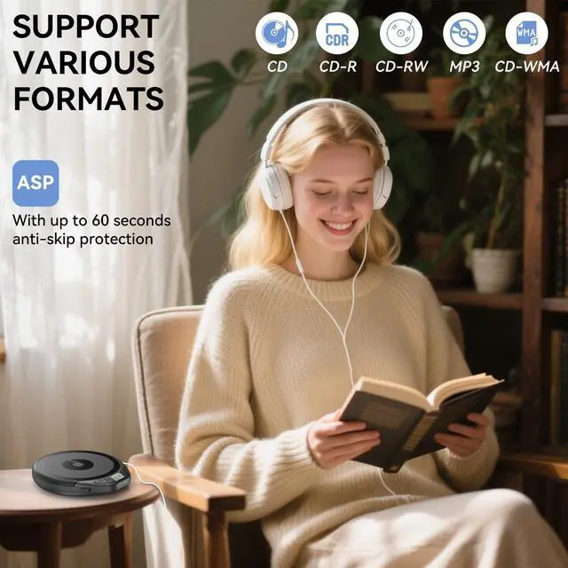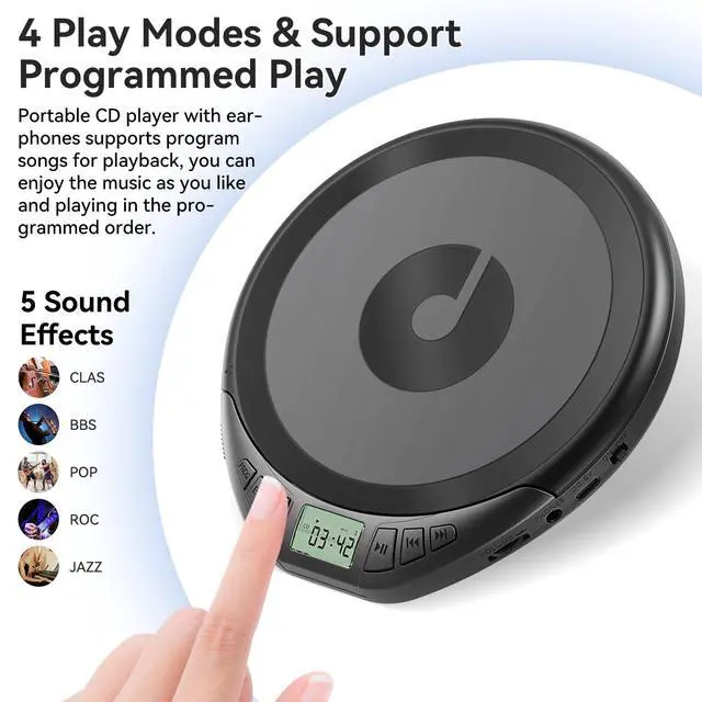 Playback Modes: This Kegaudio portable CD player offers universal compatibility with CD, CD-R, CD-RW, MP3, and WMA formats. The backlit LCD display, 5 customizable sound effects (BSS, Pop, Rock, Jazz, Classic), and 4 play modes (Repeat, Shuffle, Intro, Normal) provide a versatile listening experience. ^^ Anti-Shock Protection for