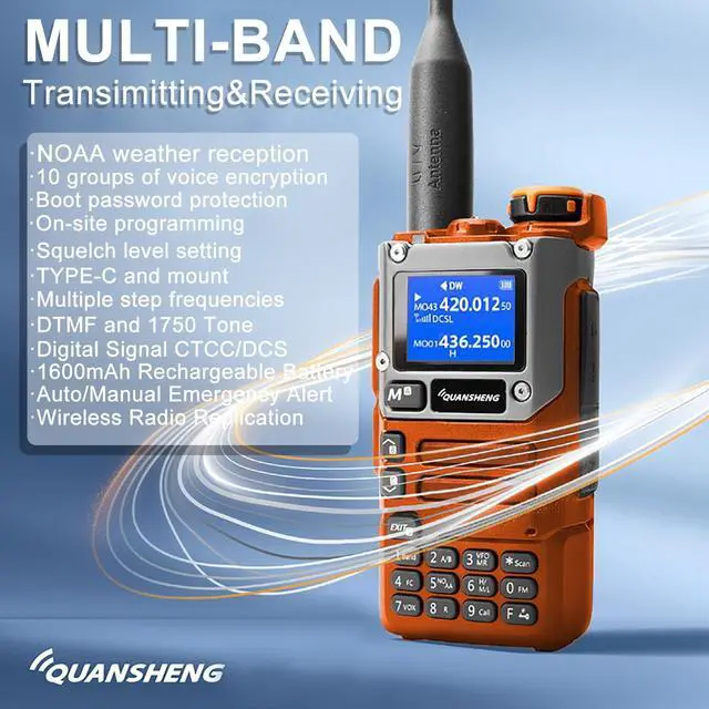Functions: Wide frequency range (144-148MHz 420-450MHz ); Frequency copy/counter funcion; Larger display; Side mounted USB-C charging port; AM aircraft band; FM; DTMF; NOAA weather alarm etc