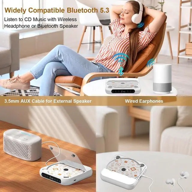 ^^ [Bluetooth CD Player]: CD players applied for newest bluetooth 5.3 technology, it can easily connect with bluetooth receiving devices such as bluetooth earphones and speakers. This CD player is a bluetooth transmitter without bluetooth receiver function, so it cant connect to bluetooth transmitting devices such as mobile phones and computers. It can also be connected to car players through AUX or Bluetooth (not all cars, some car systems do not support CD players). ^^ [Widely