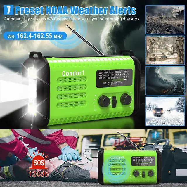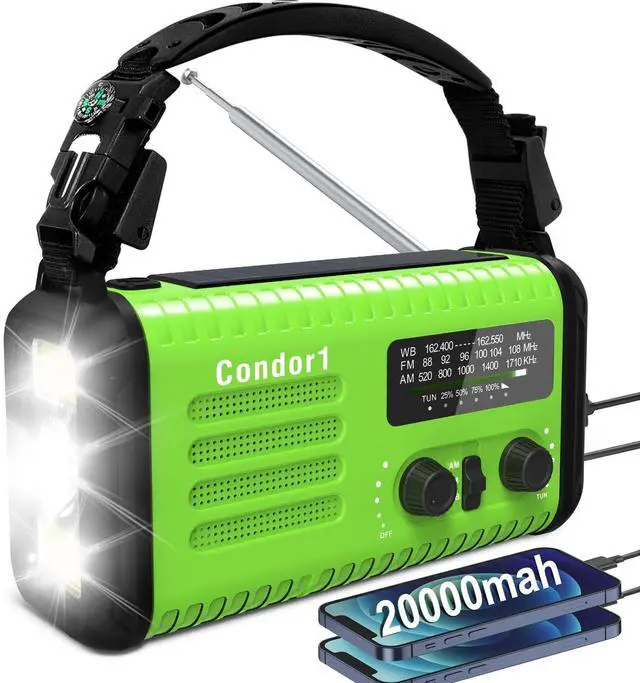 POWER BANK: Built-in 20000mAh 74000mWh charges 3 ways: hand crank, solar, USB. Condor 1 supports charging two devices simultaneously, Perfect for weeks-long outages or wilderness tripskeeps devices powered so you never miss critical weather updates.