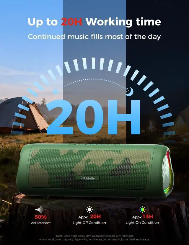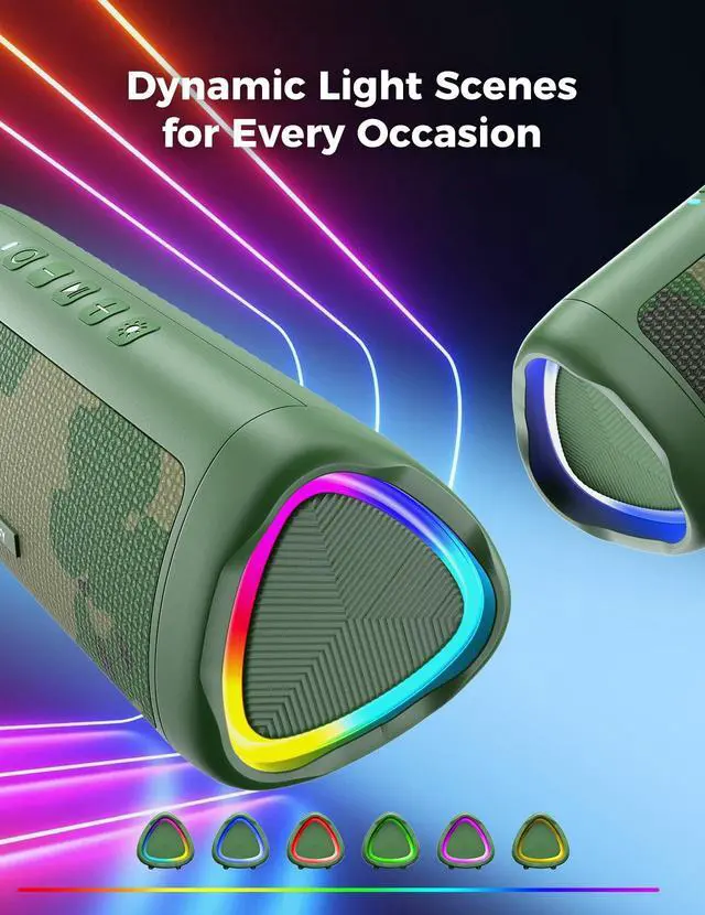 [Immersive Sound Experience & Dual Connectivity] Experience unparalleled sound quality with this wireless Bluetooth speaker's 2 drivers and advanced technology that delivers powerful, well-balanced sound with minimal distortion. Connect two speakers together to create an immersive stereo sound experience and fill any room with powerful sound. Perfect for gaming, music, and movie playback ^^ [Tough & Weather-Resistant] Engineered to handle rough use and adverse weather conditions, this speaker features a durable design and an IPX5 rating for protection against water splashes and spills. It's an ideal choice for outdoor events, and is perfect for use at parties, at the pool, on the beach, while camping or hiking, and more ^^ [Long-lasting Playtime & Extended Bluetooth Connectivity] Experience extended playtime with up to 20 hours(50% Vol and light off) per charge and extended wireless range with Bluetooth 5.3, reaching up to 33 feet from your device.