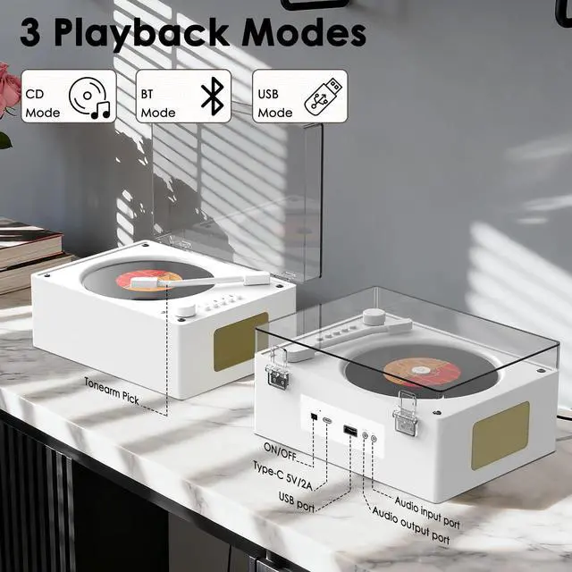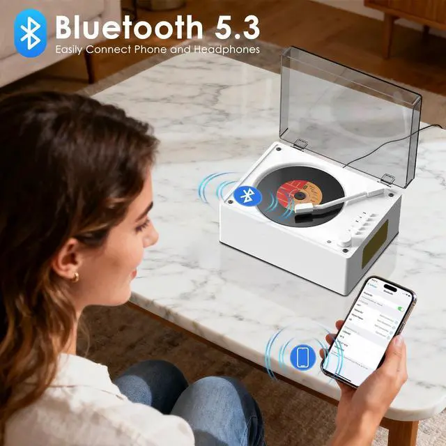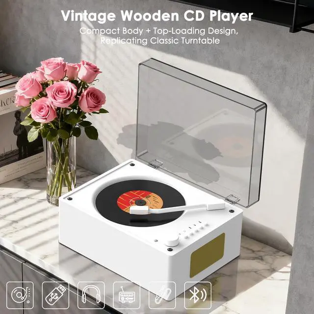 Multi-Function Blue CD PlayerPROTKPETS portable CD player not only plays CDs but also functions as a Bluetooth speaker. It can be connected to a phone for music playback and can also be connected to a computer via a 3.5 mm audio cable and supports USB playback. ^^ Retro CD PlayerFeaturing a vintage walnut design and an acrylic dust cover, combined with modern Bluetooth speaker functionality, this compact and compact player is perfect for home, office, and outdoor use. ^^ Wide Compatibility CD player for home includes a remote control and is compatible with CD, CD-R, CD-RM, CD-G, MP3, WMA, and WAV formats.