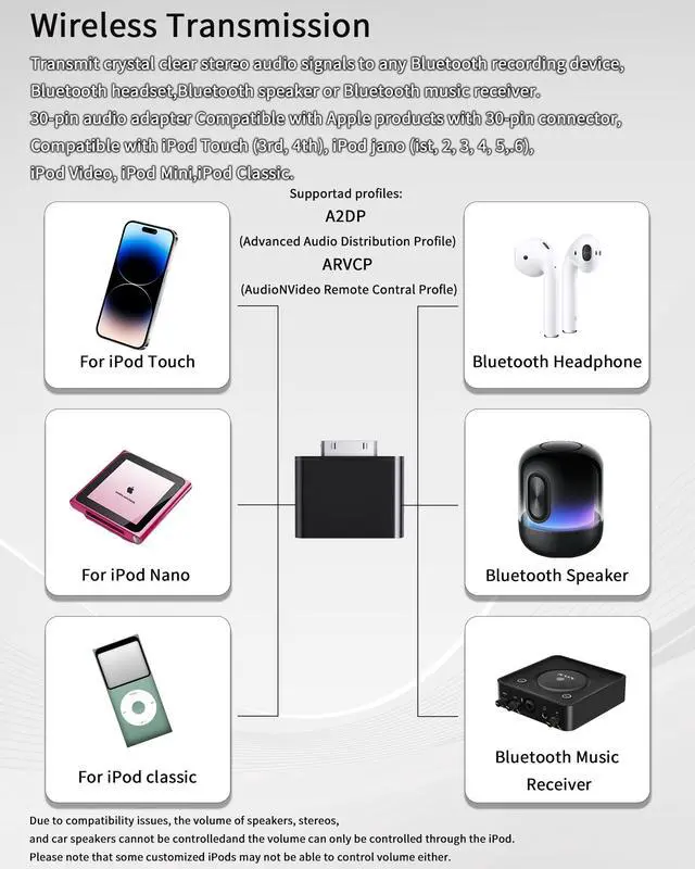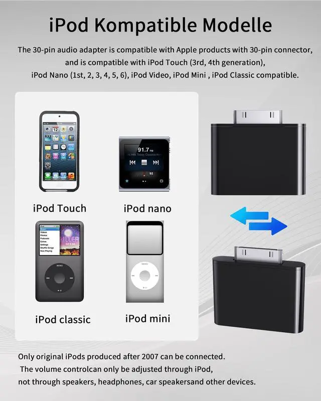 UNIVERSAL COMPATIBILITY: Works with iPod Classic, Nano, Touch, Mini, and Video models through the 30-pin connector port for reliable audio connection ^^