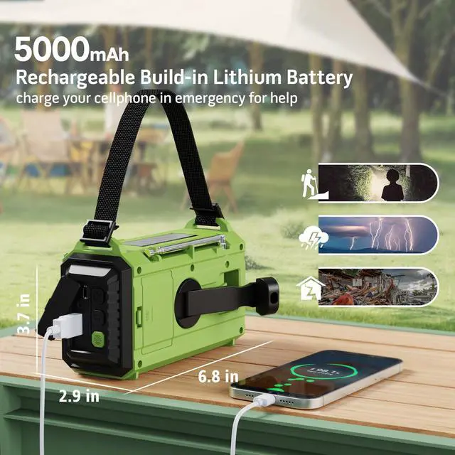 ^^ // Enjoy strong, clear reception on local FM AM stations for music and news, or explore global updates on shortwave. Instantly locate stations with the - function and view exact frequencies on the LCD screen. ^^, Equipped with a robust 5000mAh (18500mWh) Li-ion battery, the survival radio is ready for daily emergenciesdelivers up to 13 hours operation at medium volume, and can charge your devices. For extra peace of mind, recharge anywhere, under any condition with the - monocrystalline solar panel, hand crank, micro USB, wall outlet, or 3 AAA batteries.