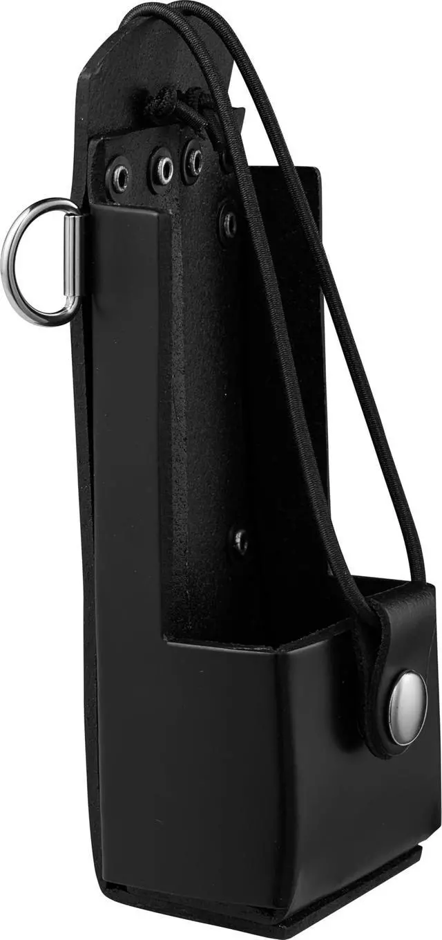This vital feature supports immediate retrieval and replacement, which is critical in emergency response, firefighting, and security operations. The holder attaches securely to your belt via a robust leather belt slide designed to fit most standard duty belts. For additional mounting flexibility, a built-in, corrosion-resistant metal D-ring allows for easy connection to harness systems and radio straps, adapting to your preferred carry style without sacrificing stability. The pocket dimensions are 2.5"" wide by 1.5"" deep, with a front height of 2"" and a back height of 7"", creating a secure and stable pouch for your device.