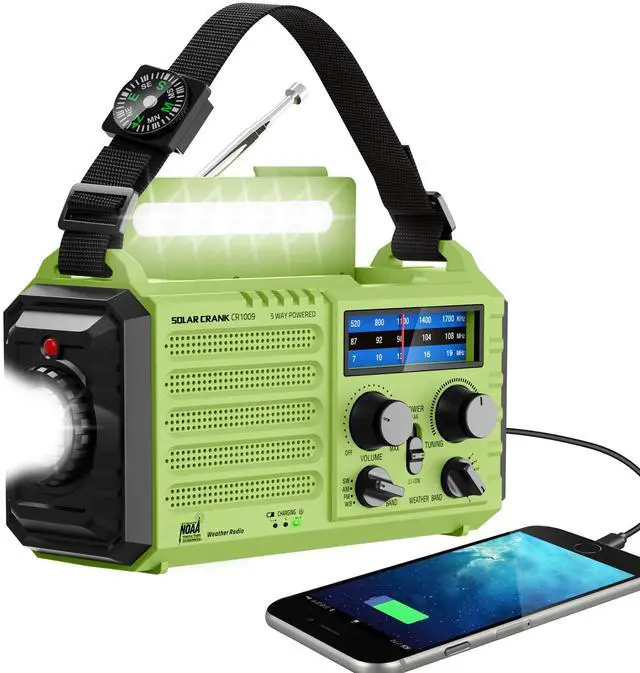 ^^ Versatile for EmergencyBuilt in USB output port, this can charge more than one cellphone for important calls or texts. The side SOS button can make loud Alarm (116dB) with red light to look for help. Besides, the compact light weight noaa emergency weather radio comes with a compass, hand strap, perfect for outdoor camping, field survival, hiking, trekking and night biking. We care you and provide one-year warranty, just email us with any question.