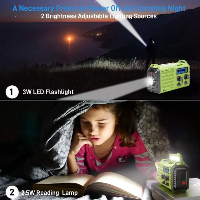 No more power failure concerns in any situation. The full charged solar radio will last up to 13 hours only playing FM radio. ^^ All-in-One Portable Radio with LED Flashlight/Reading LampOur is also designed for outdoor survival- providing 2 light sources. The side 3W LED flashlight emits strong and straight light to light up 80 meters away. A very vital survival gear and equipment if you are lost at night. 2.5W Reading Lamp with 2 adjustable brightness- Flipping up the solar panel makes the emergency crank radio a reading lamp with 6 built-in LED bulbs to illuminate 20 room or campsite.