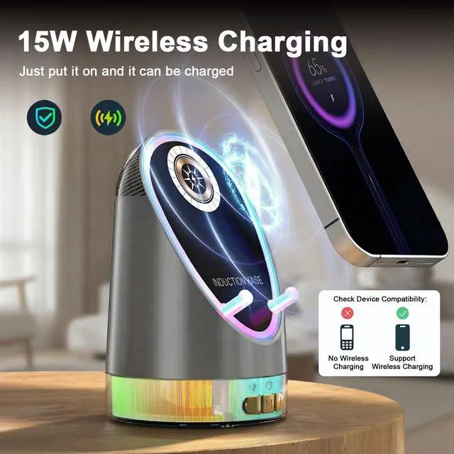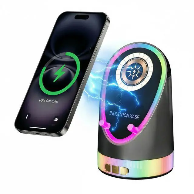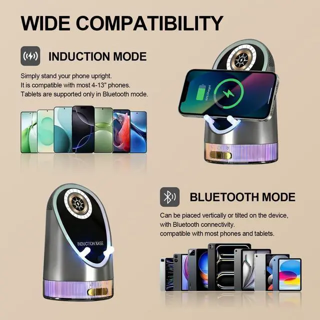 Experience Sound Freedom: Your All-in-One Entertainment HubMeet the ultimate fusion of innovation and convenience. This Wireless Induction Bluetooth Speaker redefines portable audioby combining cutting-edge wireless induction technology, immersive Hi-Fi sound, a practical phone stand, and versatile charging in one sleek, compact device. Designed for the modern lifestyle, it seamlessly transitions fromyour home desk to your outdoor adventure, eliminating clutter andenhancing every moment with rich sound and smart functionality.