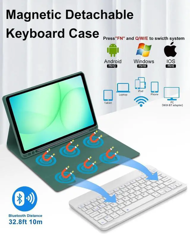 Magnetically Detachable KeyboardFor Samsung Tab A9 Plus keyboard is magnetic and it can be strongly attached to the case or detach completely. When you do not need the keyboard can be stored away, easy to carry it on the go. It is easy, fast and stable to connect via BT, reconnect immediately turning it on