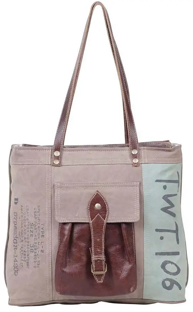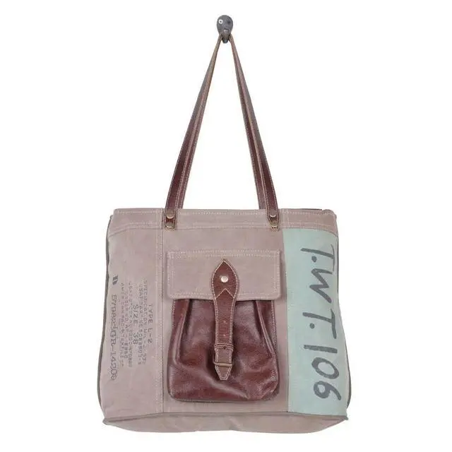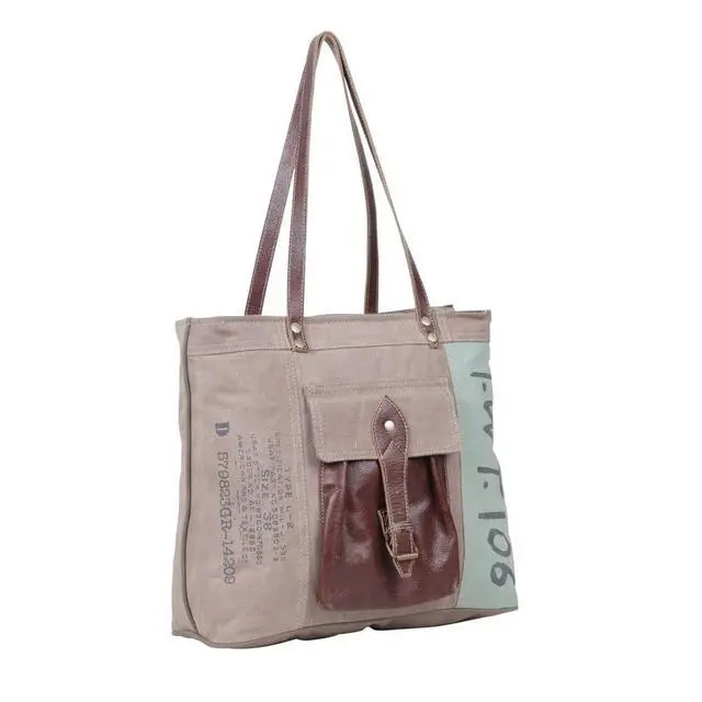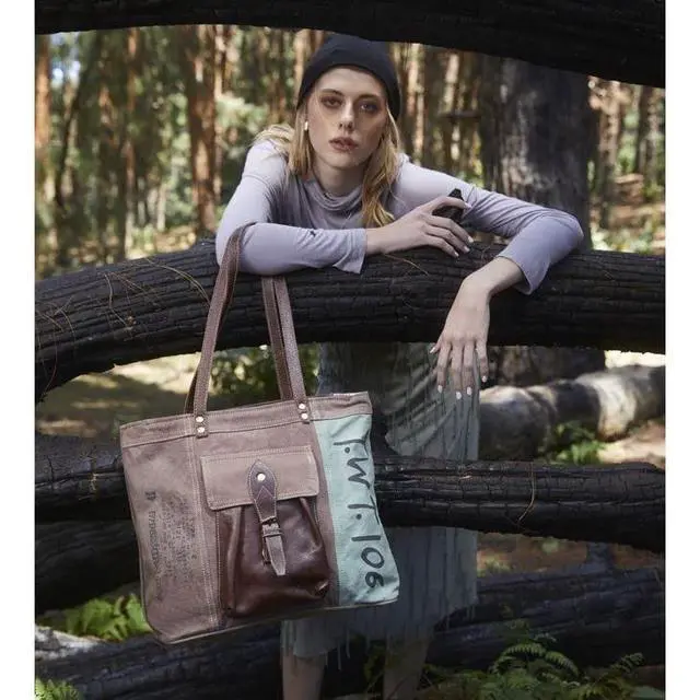 DescriptionThis beautiful tote bag is perfect for everyday use. Made of premium leather and high-quality canvas, this bag is built to last, with strap for convenience. This stylish canvas bag is the perfect accessory for every woman. It has a secure and durable design that makes it the perfect bag for work or travel. Made from quality material, this unique bag follows a specific process in the creation of upcycled canvas purses. Carry it anywhere and ensures that both the functionality and style of each piece. Each item is carefully hand-crafted and has their own unique characteristic due to the various recycled yet durable materials used in creating these masterpieces.