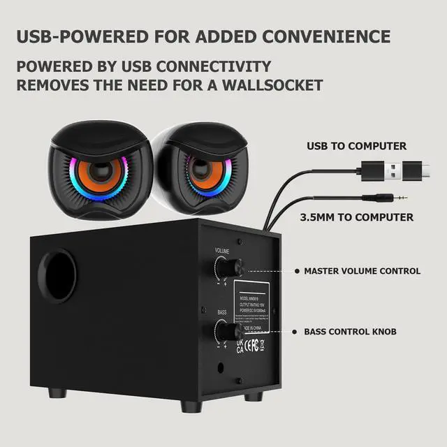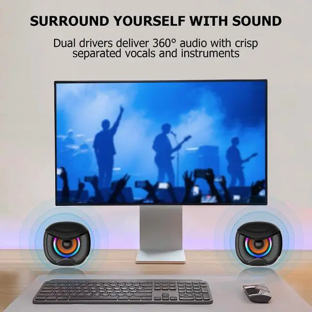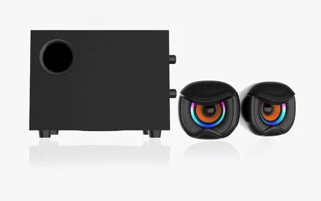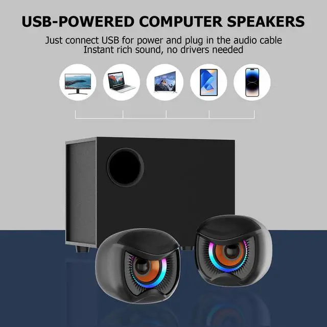 desktop speakers with subwoofer ^^ Computer Speakers, Gaming Stereo System with RGB Subwoofer, Wired USB Powered 3.5 mm Auxiliary Speakers for PCs, Laptops ^^ This is a desktop computer speaker system, a dedicated 2.1 -channel stereo system for gaming. ^^ It features a 2-inch tweeter and a 3-inch woofer, with desktop speakers and a subwoofer. ^^ The wired USB-powered 3.5 mm auxiliary speaker is compatible with PCs, laptops, tablets, and mobile phones.