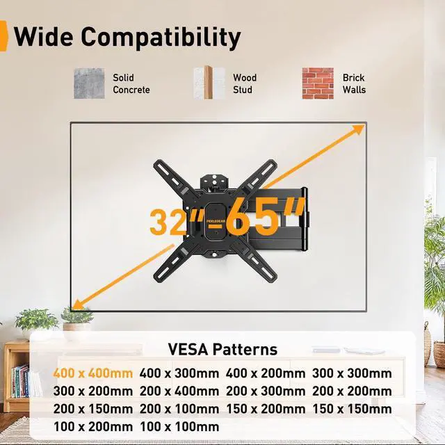 Wide Screen Compatible: The Perlegear corner TV wall mount is compatible with most 32-65 TVs with VESA mounting patterns 100x100mm to 400x400mm. Whether you're installing on a single wood stud or solid concrete walls, this 55 inch mount is secure and stable. Please note that this mount cannot be installed on drywall alone. Please check your TV Size and VESA patterns before ordering.