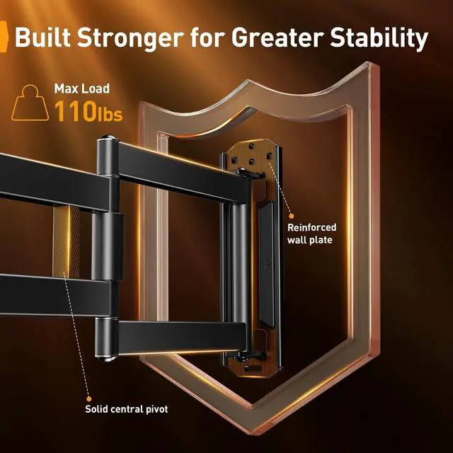 ^^ Unparalleled Strength: Constructed from thicker, heavy-duty steel with a reinforced wall plate and solid central pivot, this full-motion TV mount is exceptionally stable and durable. The swivel TV wall mount can securely hold up to 110 lbs, even fully extended. No wobbling or sagging a mount that's safe and secure. ^^ Flexible with