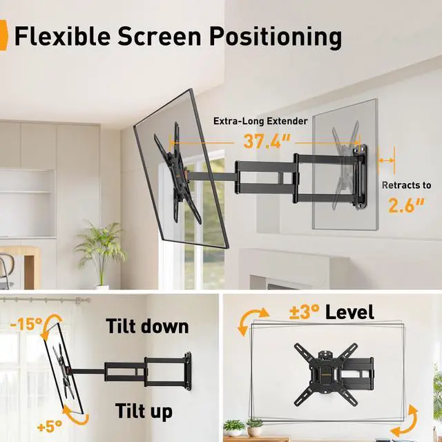 Extra-Long Reach: This long arm TV mount extends 37.4 from the wall to cover multiple viewing areas and retracts back to 2.6 for a clean look. The 55 inch TV wall mount features +/-90 swivel to direct the screen towards you, +5/-15 tool-free tilt to reduce glare, and +/-3 leveling after installation.