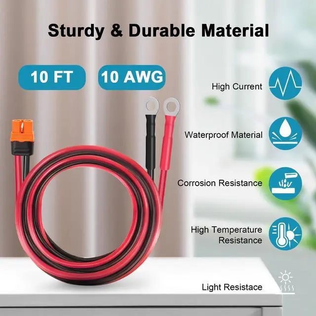 High-Efficiency Charging Cable -- The XT60i to O Ring terminal cable is made of 10AWG tinned copper wire, which minimizes power loss and improves charging efficiency. The solar wire shell is made of durable insulating material, which has great insulation effect and is heat resistant to 105. ^^ XT60i Connector -- The XT60i connector has an anti reverse connection function, which can prevent users from accidentally reversing the positive and negative polarity when connecting the power supply to the device. IP67 waterproof rating, moisture resistant, not susceptible to moisture and dust contamination, maintains a stable connection to the device and improves the safety and reliability of the connector ^^ Easy to Use -- XT60i connectors fit most solar panels and battery packs.