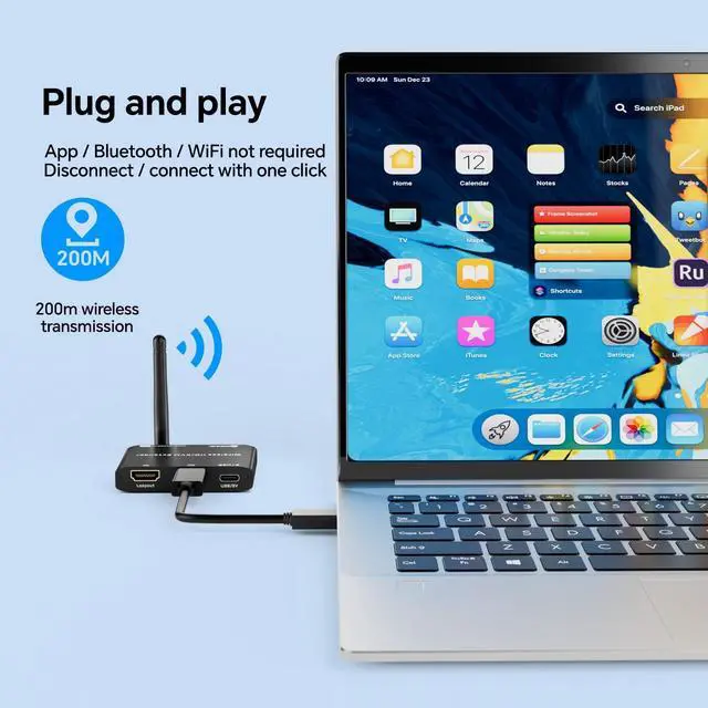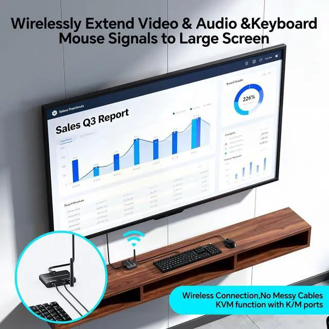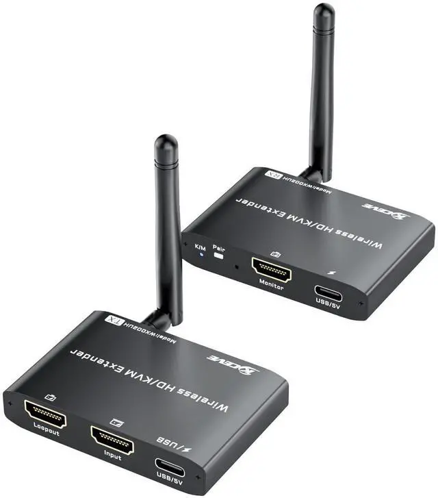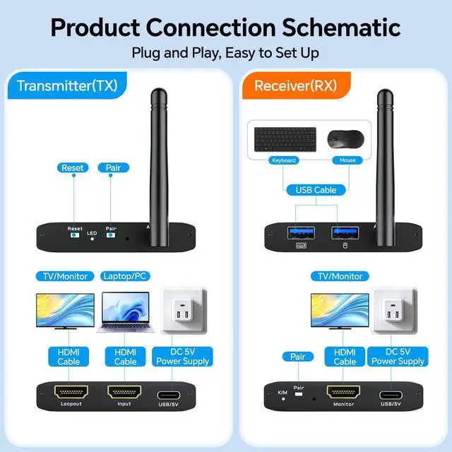 For filmmakers, directors, photographers, speakers, and hosts who require real-time previews, this makes it an ideal choice ^^ Dual Antennas + Dual-Band TransmissionThis HDMI wireless transmitter/receiver extender comes with dual high-gain external antennas and supports 2.4G /5G dual-band transmission. The dual antennas enhance signal penetration and anti-interference capability while reducing latency, the dual-band technology intelligently switches to the optimal frequency in multi-device environments for stable connectivity ^^ Wireless Mirroring & Extended Display USB HDMI KVM Extender 2 Monitors choose between mirroring or extending your screen to adapt to your needs. Effortlessly project content from laptops, cameras, or TV set-top boxes to HDTVs, projectors, or monitors, offering a versatile, multi-functional experience ^^ Wide CompatibilityThe Wireless HDMI transmitter and receiver is plug-and-play, requiring no software drivers.