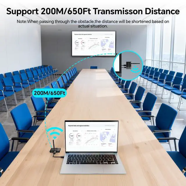 200m Long-Range Wireless HDMIThe wireless HDMI KVM Transmitter and Receiver delivers a stable, interference-free 200m (650ft) signal, KVM HDMI USB extender can wirelessly transmit HD audio/video from a PC, laptop or camera to a TV, monitor or projector, with dedicated keyboard mouse port on RX end, wirelessly extend the keyboard and mouse signal ^^ 1080P@60Hz HD Video ExperienceThis wireless HDMI transmitter and receiver supports 1080P resolution, delivering sharp and clear video transmission. wireless HDMI suitable for various scenarios such as live events, surveillance setups, and gaming devices ^^ Wireless HDMI Transmitter with Local Loop-out PortThe local HDMI loop out feature allows you to monitor video on a local screen, HDMI wireless can simultaneously transmit signals to remote HDMI receivers.