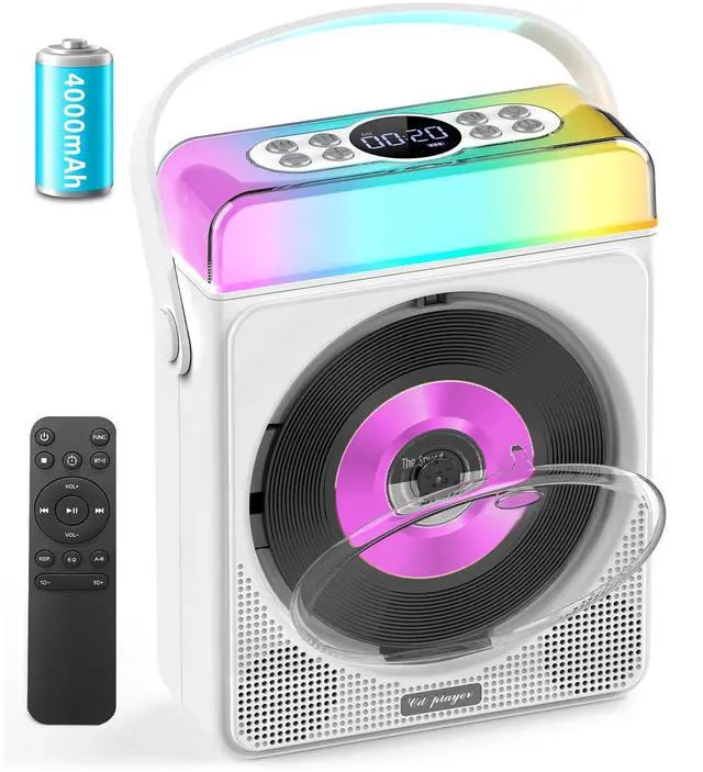 Choose from 3 modes: Dynamic Multi-Color (rainbow cycling), Breathing Light (soft fade in/out), or Solid Color (tap to switch hues). Perfect for kids, bedrooms, or partiesyour music, your glow. ^^ Bluetooth Transmit & Receive Play Your WayEnjoy total flexibility with this portable CD player with Bluetooth. In Transmit Mode, connect wireless headphones for private listening. In Receive Mode, turn this CD player with speakers into a Bluetooth speaker for your phone or laptop. Perfect portable cd players for home. 10m range + remote control = hands-free convenience. ^^ Long-Lasting Power for Every OccasionThis portable Bluetooth CD player packs a 4000mAh rechargeable battery for up to 11 hours of playtime. Perfect for backyard BBQs, camping trips, or chill nights at home. The rechargeable cd player portable charges via USB-C (cable included). ^^ Smart Features, Easy ControlCustomize sound with EQ, set a 1090 min sleep timer, or loop songs for study or sleep. Our personal cd players are simple, fun, and durableperfect for kids, learning, or relaxation. A great Bluetooth CD player for home or travel that makes music easy anytime.