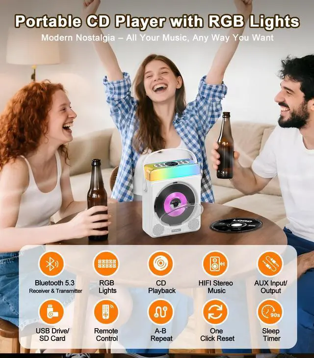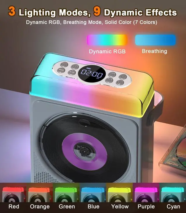 Modern Nostalgia All Your Music, Any Way You WantBring back classic CDs and mix them with modern tech! This portable CD player with Bluetooth supports CD, CD-R/RW, MP3, and WMA. Stream wirelessly or play directly via USB, TF card, or AUX. A must-have cd player with speakers for home or travel. ^^ Mood Lights That Dance with Your MusicLight up your vibe with this portable CD player with speakers and RGB lights!
